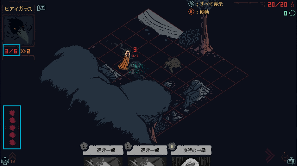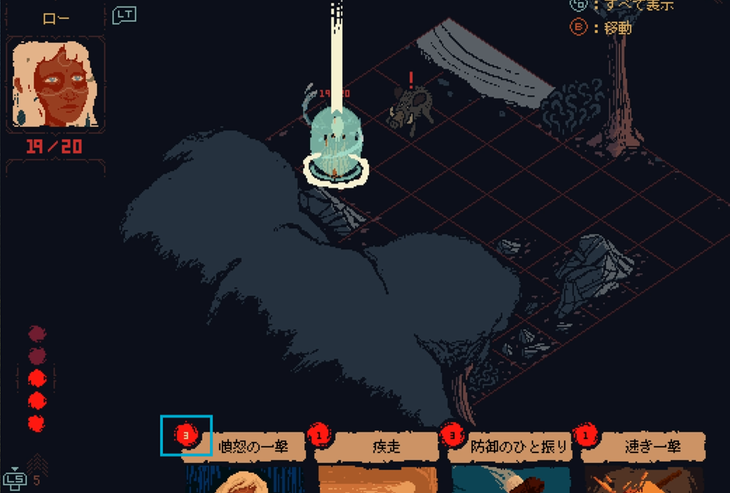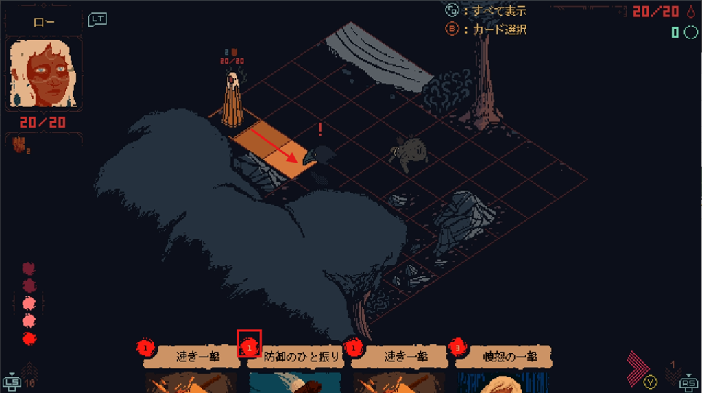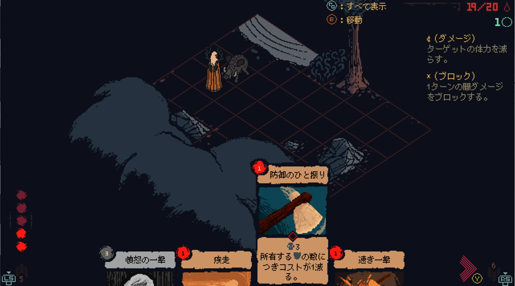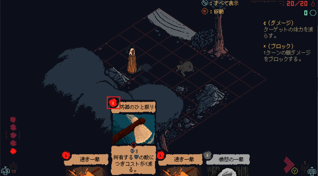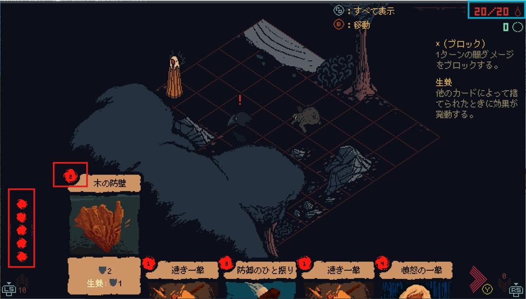 右上に表示されている「20」がライフ。ダメージを受けると減少で「0」になると負け。回復アイテムとかはなく、聖なる木立を利用する(領域によっては戦闘時に過給のスキル発動で回復可能)。行動は左に表示されるマナを消費して行われる。移動一マスでマナ一つ。カード使用は左上に書かれた数字分のマナを消費する。