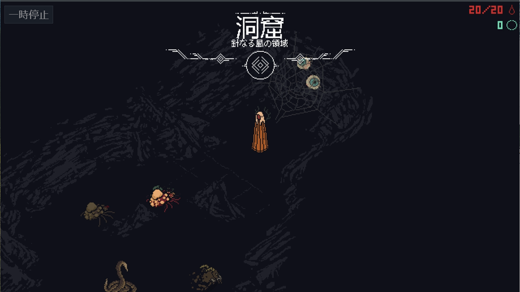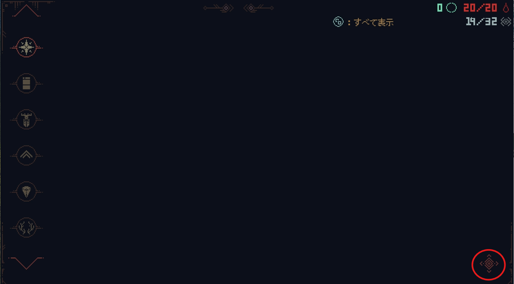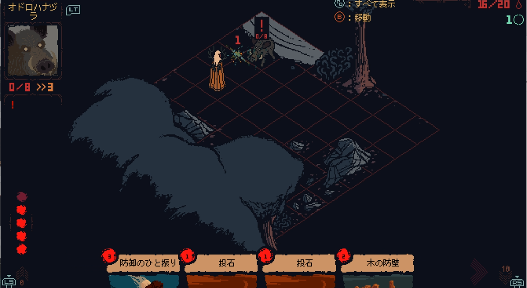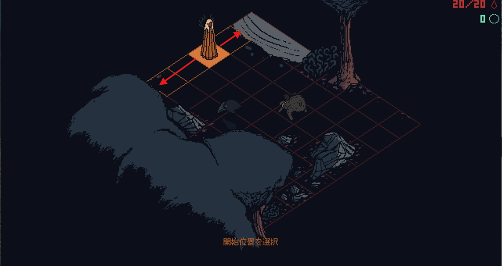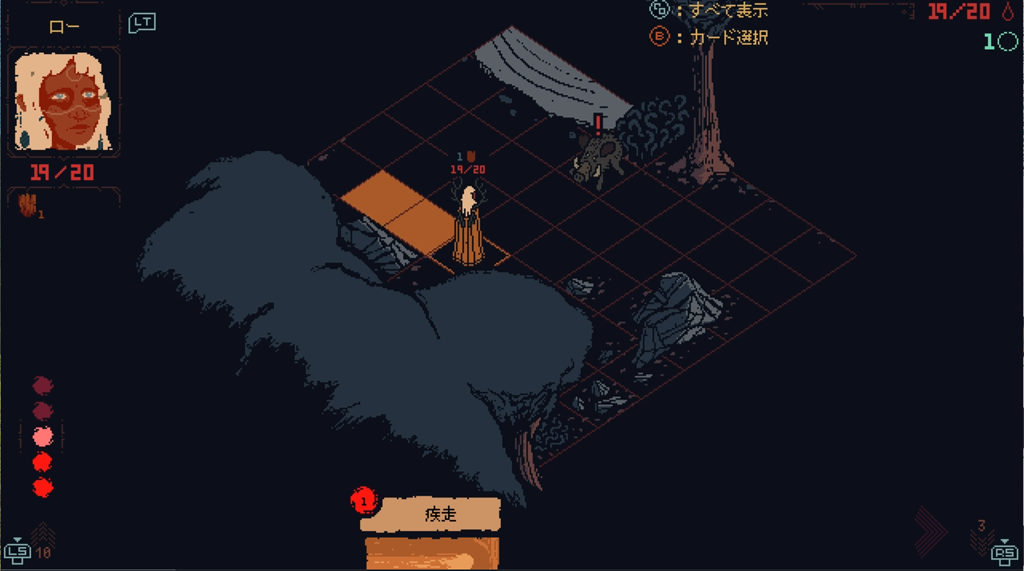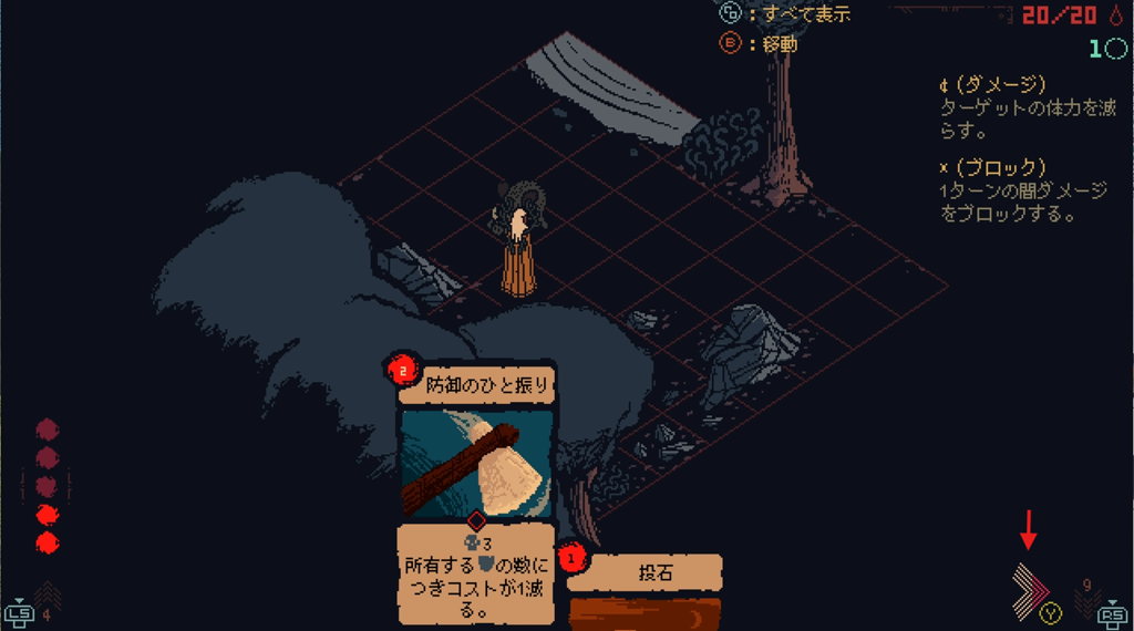 右上に表示されている「20」がライフ。ダメージを受けると減少で「0」になると負け。回復アイテムとかはなく、聖なる木立を利用する(領域によっては戦闘時に過給のスキル発動で回復可能)。行動は左に表示されるマナを消費して行われる。移動一マスでマナ一つ。カード使用は左上に書かれた数字分のマナを消費する。