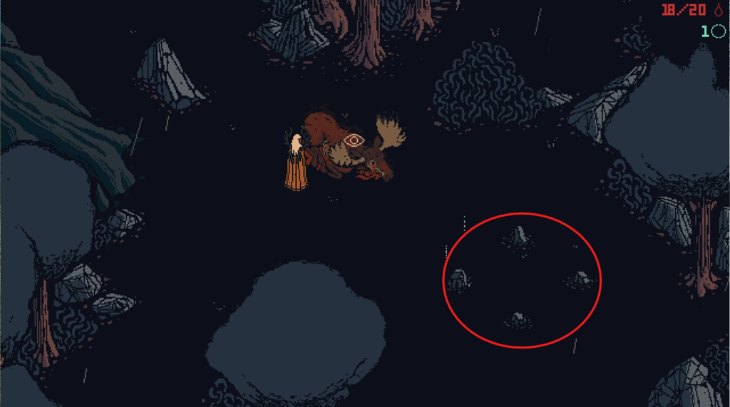 イノシシさんを一匹倒して、聖なる木立へ。ここの機能は3つ。ライフの回復、倒した精霊の復活、それと死の咆哮を涙の滴に変換。