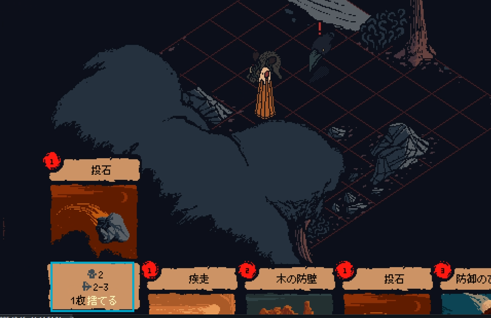 前回のターンの場所から一マス動いて、カラスの前に。「投石」による遠距離攻撃をしようと。カードの意味は与えるダメージは2、攻撃可能エリアはローの縦横方向の2マス目と3マス目。だから隣のマスへの攻撃はできない。