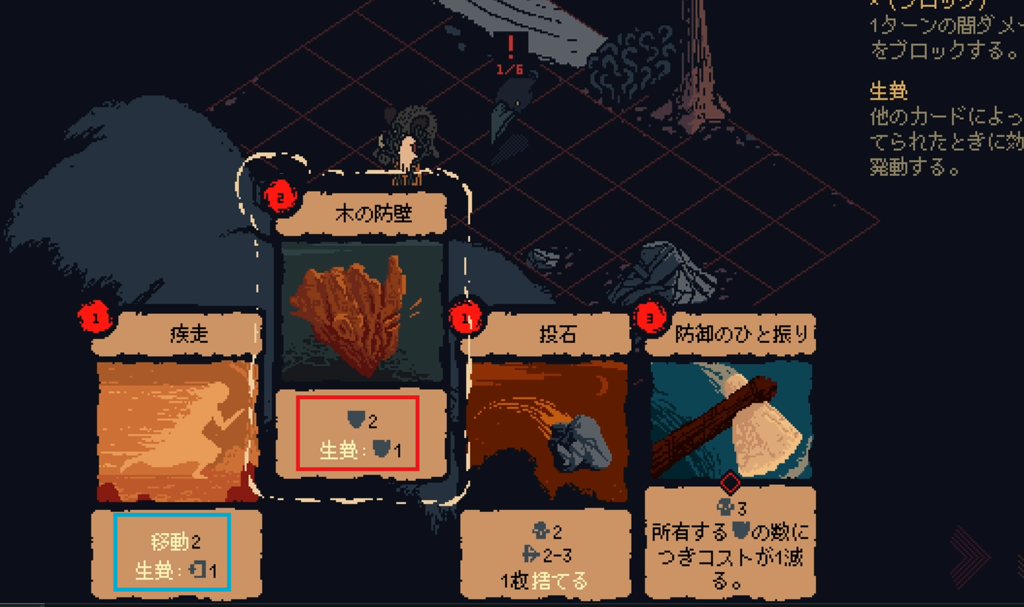 それに加えて「1枚捨てる」なので、手札を1枚捨てないといけない。カードによっては「生贄」が設定されている。「木の防壁」を捨てるとアーマーを1つ獲得。「疾走」を捨てると手札を一枚引いてこれる。デバフのカードを付与されることがあるんだけど、捨て札としてなら安全に除ける。