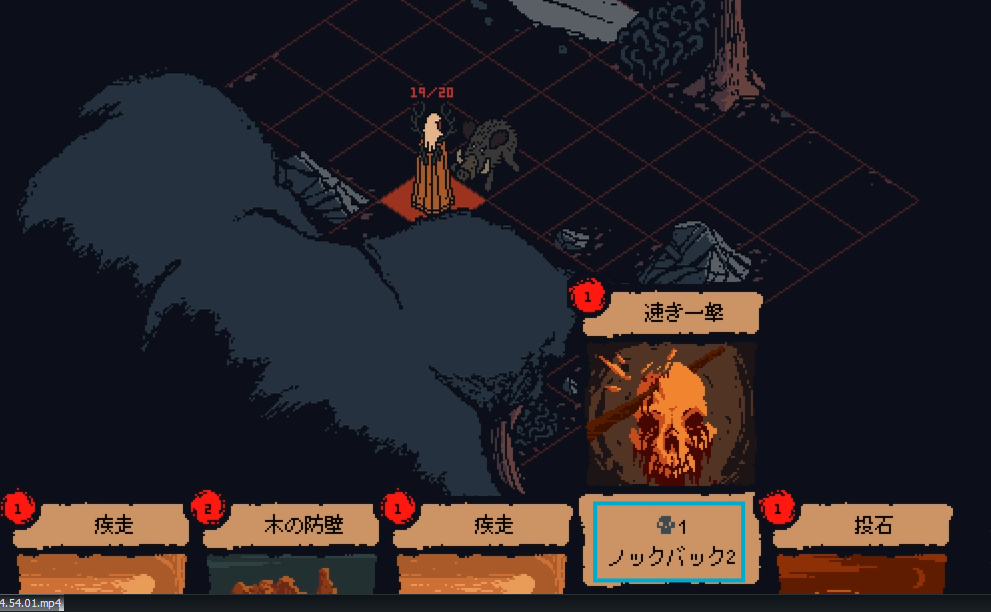 「木の防壁」を使って一マス近づき、「防御の一振り」と「速き一撃」でイノシシのライフは残り1。
