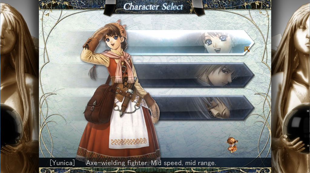 一番下のトールは他のキャラクターでゲームをクリアしないと選択できない。プレイしやすいのはユニカだと思う。ヒューゴは遠距離攻撃ができるけど、移動速度が遅い。ユニカに比べるといろいろあって、さすが、イース一作目のラスボスのご先祖という感じ。トールは選択できるようになったら、是非、やってみてほしいかな。ユニカとトールではストーリーが進むごとに二人の女神との関係が所々で描かれる。