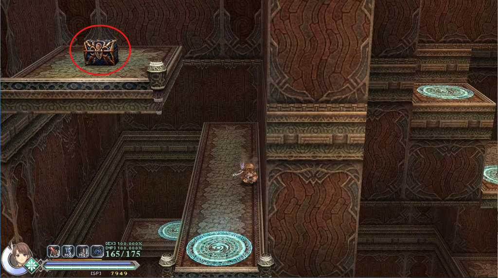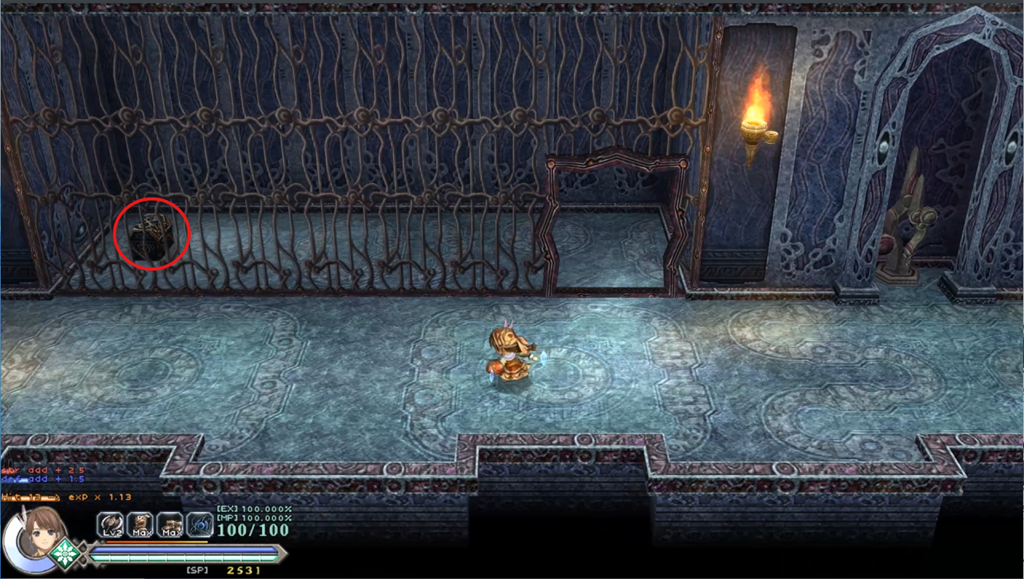 ゲームを開始して間もないところだけど、宝箱を開けると閉じ込められる。近くの金ぴか鎧を楽に倒せるようになってからが無難。